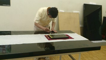 漆塗りの家具には繊細な彫刻が施されています。この一彫一彫が彫漆の職人さんの技術です。細かい作業ですから見ているこちらが緊張します^^;。簡単な下絵の上に、どんどん彫っていかれます;;これが熟練技なんですね。